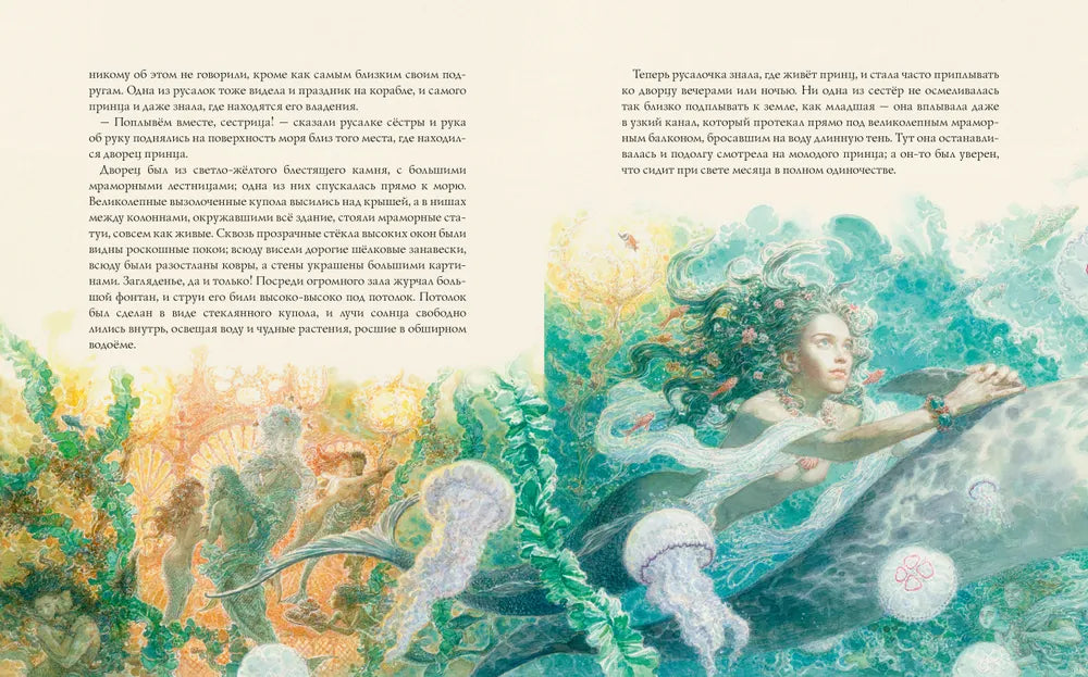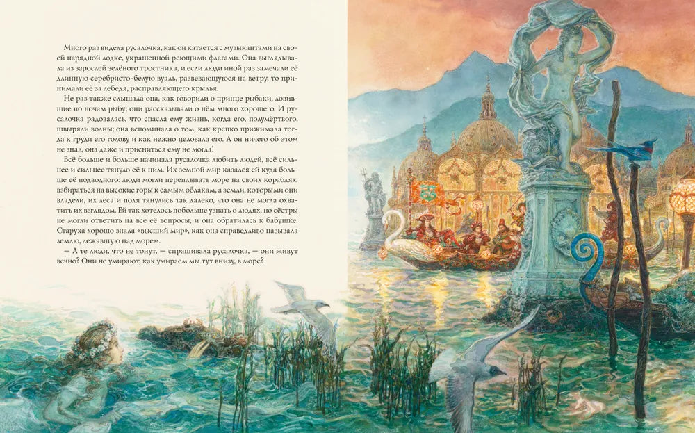 История Русалочки — волшебная и печальная. Яркие оттенки бирюзы и блеск солнца на морской пене соседствуют в ней с сумрачными тонами океанских глубин, напоминая об их страшных обитателях. Однако прежде всего это рассказ о любви. Любви неразделённой и жертвенной, но всё равно светлой и дарящей надежду. А ещё это история о том, как Русалочка обрела бессмертную душу, размышления автора о смысле жизни и её ценностях и о вере, что творит чудеса.